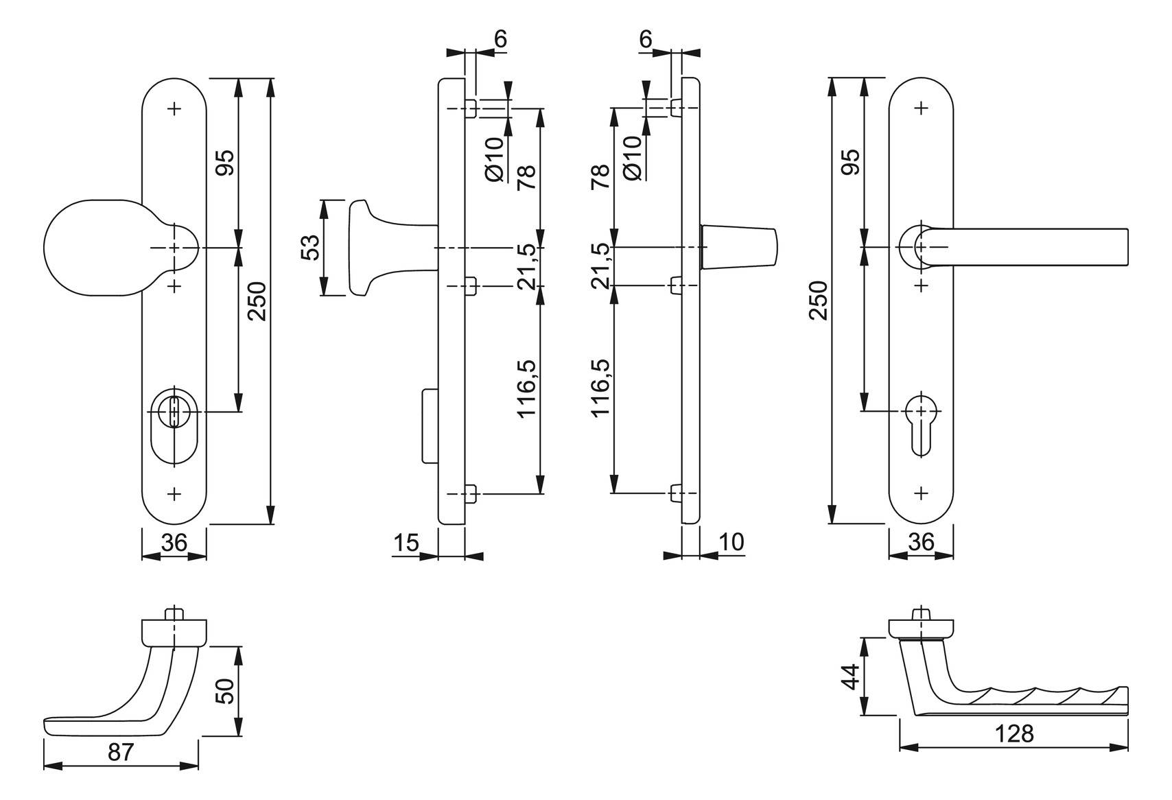 - Lagerung: außen gekröpfter Knopf fest, ummontierbar; innen Türgriff fest/drehbar, Rückholfeder, wartungsfreies Gleitlager